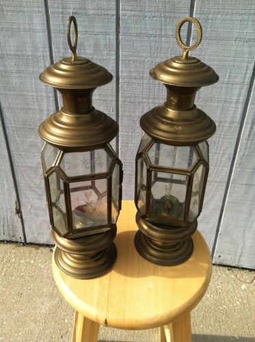 Title (ebay affiliate link): Two Antique Brass and Glass Etched Candle Holder Lantern Large 16" Tall