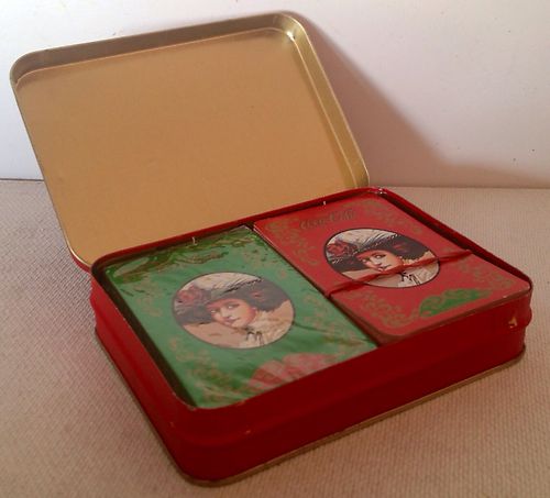 Title (ebay affiliate link): Vintage Coca Cola Playing cards old tin w/ score card 2 decks Bridge poker