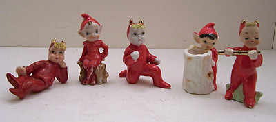Vintage Christmas German Five Bisque Snow Baby Santa Elves Dwarfs Ornament