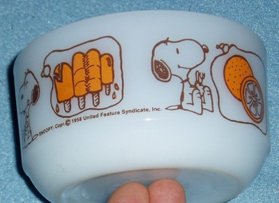 Title (ebay affiliate link): Snoopy Ice Cream Dreams Fire King Milk Glass Bowl Orange Peanuts Vintage 1960s