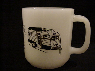 VINTAGE SERRO SCOTTY DOG SPORTSMAN CAMPER TRAILER RETRO MUG MILK GLASS CUP