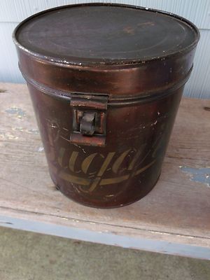 SUGAR ANTIQUE JAPANNED CANISTER TIN CAN OLD KITCHEN HINGED LID VINTAGE