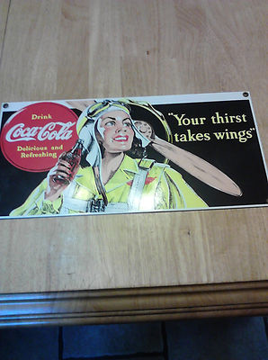 Title (ebay affiliate link): COKE COLA COKE WOMAN AVIATOR PORCELAIN REPRODUCTION SIGN BY ANDE ROONEY