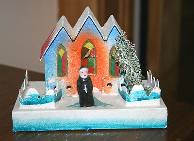 Title (ebay affiliate link): 1930s Cardboard Church. Bisque Friar in Front, Very Elaborate. Japan