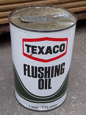 Vintage Texaco Flushing 1L Oil Can - CYLINDRICAL SHAPE in WHITE "Empty"