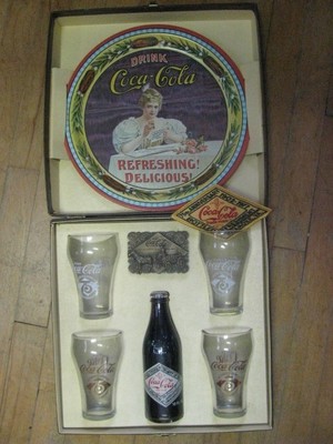 COCA-COLA 75TH ANNIVERSARY COLLECTIBLE SET-INCLUDES GLASSES,TRAY,PATCH,BOTTLE,+
