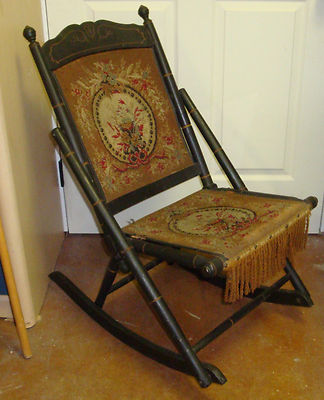 Title (ebay affiliate link): Antique Folding Rocking Chair Sewing Nursing Spindle Wood Tapestry Tassels Black