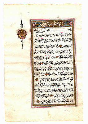 ILLUMINATED OTTOMAN QUR’AN LEAF 1262 AH (1845 AD):