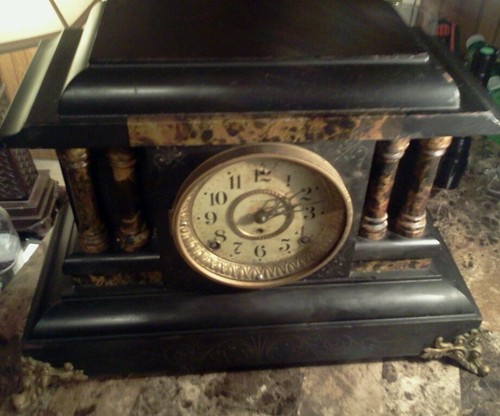 Title (ebay affiliate link): ANTIQUE SETH THOMAS ADAMANTINE MANTLE CLOCK W/COPPER COLUMNS & LIONS (No. 295)