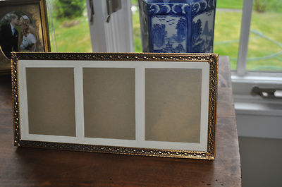 Antique Triple Matt Ornate Black Gold Metal Picture Frame Table Top or Hanging