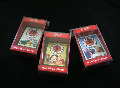 Title (ebay affiliate link): 3-NOS working vintage Coca-Cola match box table clocks