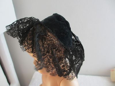 Antique Vintage Doll Mourning Bonnet Hat Black Velvet & Lace Pretty