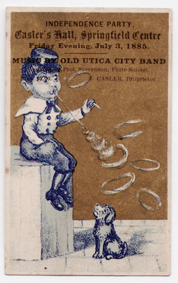 Victorian Trade Card INDEPENDENCE PARTY/SPRINGFIELD NY BOY/SMOKE RINGS/DOG 1885