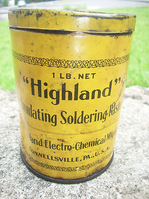 Title (ebay affiliate link): HIGHLAND SOLDERING PASTE VINTAGE TIN, CONNELLSVILLE, PA.