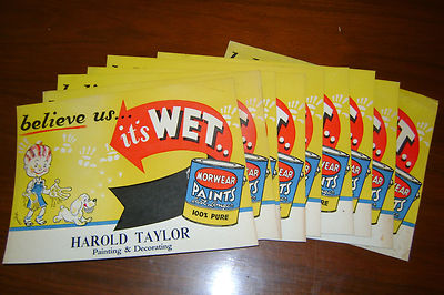 Title (ebay affiliate link): 9 VINTAGE ORIGINAL WET PAINT CARDBOARD SIGNS ~ MORWEAR PAINTS ADVERTISING~1950's