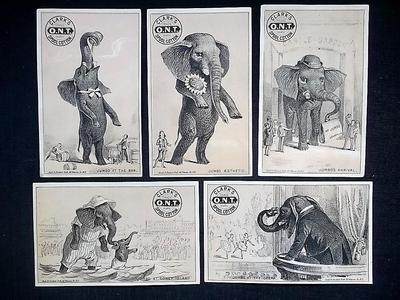 Title (ebay affiliate link): P T Barnum & Bailey Circus Side Show Menagerie Elephant JUMBO Trade Cards c 1885