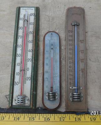 Title (ebay affiliate link): 3 VINTAGE THERMOMETERS TO HANG ON THE WALL & OUTSIDE CHANEY TRU TEMP+2 WOOD BASE