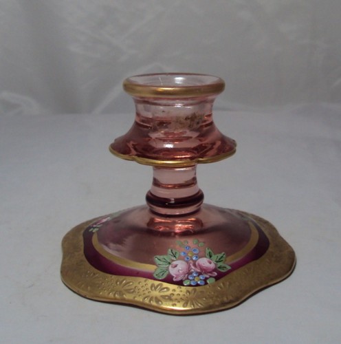 Pink Depression Glass Candlestick Holder Hand Painted Rose + Gold Trim