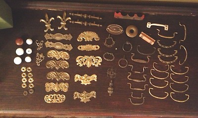 Antique Furniture Lot PULLS, PLATES, ESCUTCHEONS.Brass, Wood, Bakelite, Ceramic