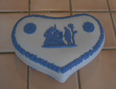 Title (ebay affiliate link): WEDGWOOD LOVELY VINTAGE WHITE JASPERWARE HEART SHAPE MUSICAL SCENE COVERED BOX!