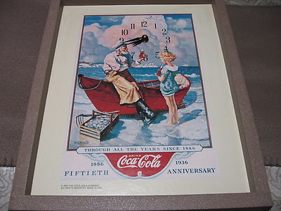 Coca Cola clock with picture of boat with sailor and girl standing next to it
