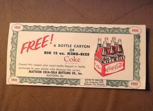 Title (ebay affiliate link): Vintage Coca-Cola Coupon For Free 12 Oz King-size 6 Bottle Carton Mattoon, Ill.