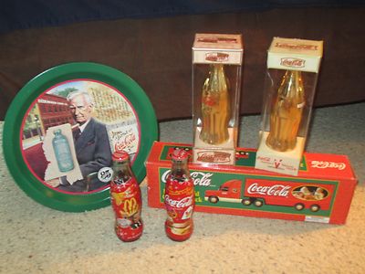 Title (ebay affiliate link): 5 piece Coca Cola Collectibles lot: Gold bottles, Truck, 50th anniversary bottle