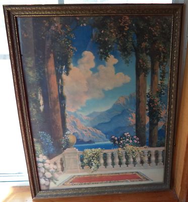 Title (ebay affiliate link): 1920's COLORFUL GARDEN LAKE MOUNTAIN ART PRINT IN ORIGINAL WOODEN FRAME