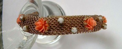 Title (ebay affiliate link): Mesh Cuff Metal Bracelet Carved Salmon Colored Flowers Milk Glass Beads Unique