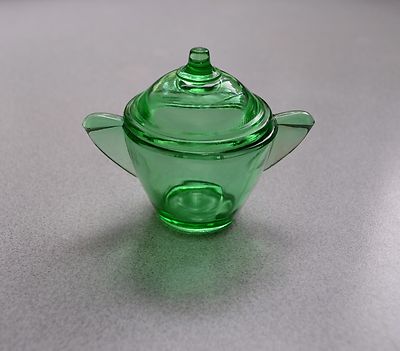 Title (ebay affiliate link): One Sugar Bowl and Lid Akro Agate Children's Transparent Green Stippled Band