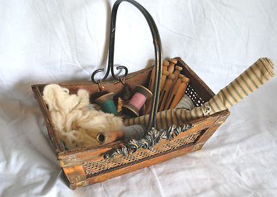 Title (ebay affiliate link): SEWING BASKET PRIMITIVE ANTIQUE YARN, SPOOLS, CLOTHS PINS.... DECOR