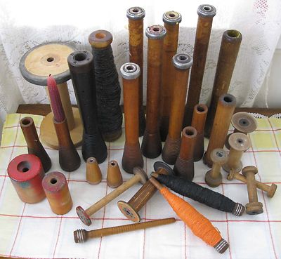 Title (ebay affiliate link): 29 Antique Primitive Textile Wood Spools~Woolen Bobbins~3" to 14"~Candle Holders
