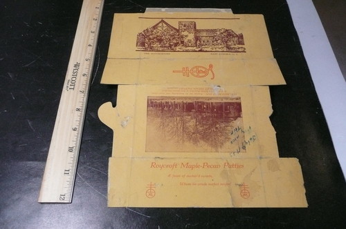 Title (ebay affiliate link): Vintage 1933 Roycroft Maple Pecan Patties Box East Aurora NY