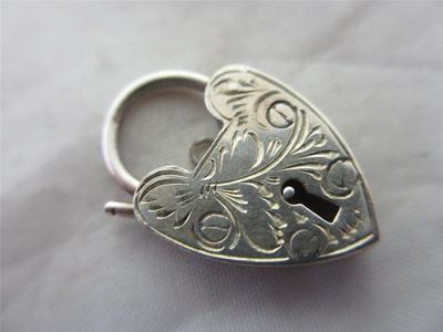 Title (ebay affiliate link): VINTAGE ENGLISH CHARM c1960 STERLING SILVER ENGRAVED SECURE HEART PADLOCK CLASP