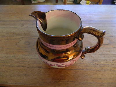Large Antique English Copper Lustre Pitcher Pink House Scene EX