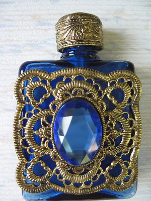 Title (ebay affiliate link): Vintage mini-perfume scent flask, cobalt blue,filagree, faceted rhinestone