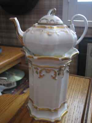 Beautiful Old Old Antique White/Gold Individual Teapot on Burner Stand--Ornate