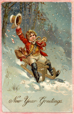 Title (ebay affiliate link): ANOTHER BOY POSTMAN ON SLED PFB LAVISH GOLD EMBELLISHMENT NEW YEAR 1911 POSTCARD