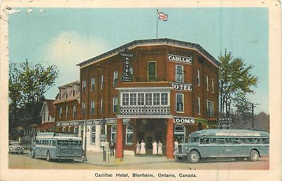 Title (ebay affiliate link): 1937 Vintage Postcard Bus's parked at Cadillac Hotel BLENHEIM Ontario