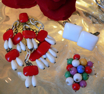 Title (ebay affiliate link): SIGNED MIRIAM HASKELL MILK GLASS EARRINGS EARLY FRUIT SALAD GLASS TLC BROOCH LOT