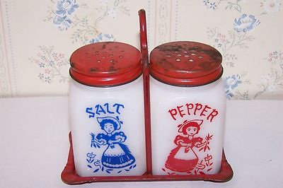 Title (ebay affiliate link): VINTAGE WHITE MILKGLASS RED TOP SALT AND PEPPER SHAKERS ON METAL TRAY with GIRLs