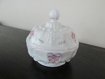 Title (ebay affiliate link): Westmoreland White Milk Glass Grape Covered Candy Dish Painted Roses
