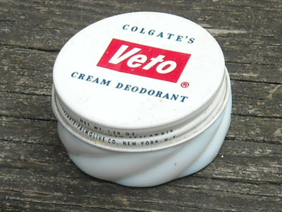 Title (ebay affiliate link): Vintage ~ Colgate VETO Cream Deodorant ~ Milk Glass Jar & Lid ~ great condition!