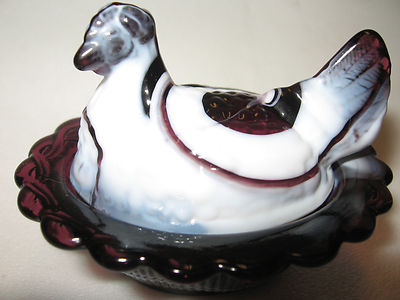 Title (ebay affiliate link): Amethyst and milk slag glass salt cellar hen chicken on nest basket dish purple