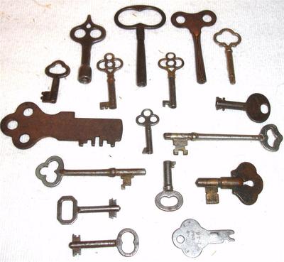 Title (ebay affiliate link): 17 VTG ANTIQUE SKELETON CLOCK BANJO KEYS DOOR BRASS STEEL HINGED KEY LOT