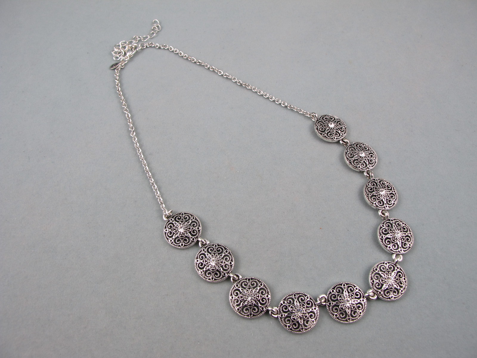 Title (ebay affiliate link): Premier Designs Sundial Antique Silver Crystal Necklace