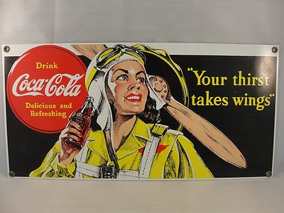 Title (ebay affiliate link): Porcelain Enameled Coca Cola Advertising Sign Aviator Woman Americana