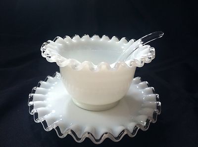 Title (ebay affiliate link): Vintage Fenton White Silver Crest Ruffle Milk Glass 3 Piece Bowl Saucer Ladle
