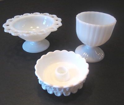 Title (ebay affiliate link): 3 Vintage White MILK GLASS Items - Fenton Candle Holder / Candy Dish / Planter