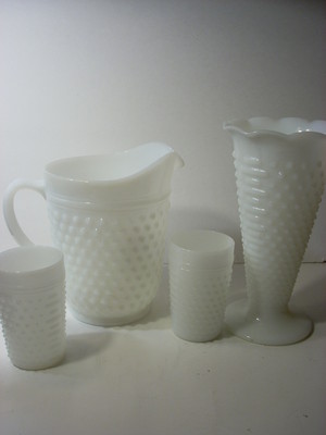 Title (ebay affiliate link): Vintage Hobnail White Milk Glass Water Pitcher and Glasses Anchor Hocking